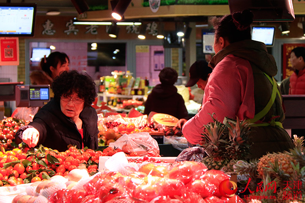人民网天津2月18日电 (孙一凡)“叠个千纸鹤,再系个红飘带,愿善良的人们天天好运来……”大门宽敞、通道干净、蔬果五颜六色、熟食在玻璃罩里显得格外新鲜,这样的场景配上一段优美的音乐,让市民群众舒适的“买买买”……这不是在哪个超市,而是在位于天津市河北区的宜景菜市场。日前,人民网天津频道跟随天津网络媒体新春走基层采访团来到这里,了解市场运营发展情况。