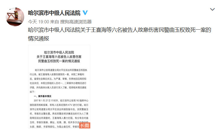 央视网消息(记者 李文学)针对备受社会舆论关注的民警曲玉权除夕被害一案,1月20日,哈尔滨市中级人民法院在其官方微博进行了通报。通报中说,各被告人并无追求曲玉权死亡的主观故意,曲玉权死亡系在患有冠心病基础上因厮打等行为导致病发身亡。判处各被告人13年至6年有期徒刑,符合罪责刑相一致原则。本案一、二审认定事实清楚,证据确凿,定性准确,量刑适当,审判程序合法。
