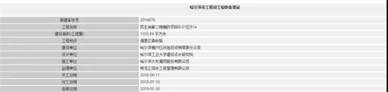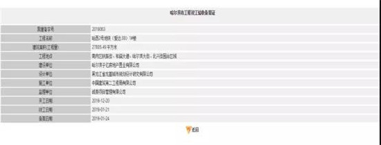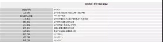 中国房地产报记者在哈尔滨市住房和城乡建设局官方网站查询获知,“证照查询管理系统”公开信息显示,2019年1月24日,哈尔滨市住房和城乡建设局核发了14本《哈尔滨市工程竣工验收备案证书》,工程名称为哈西2号地块(爱达88)工程、哈西3号地块(爱达九溪)一期、二期工程,共计14栋楼,施工承包单位为中国建筑第二工程局有限公司;设计承包单位为黑龙江省龙基城市规划设计研究有限公司,监理承包单位为诚泰项目管理有限公司;建设单位分别为哈尔滨爱达投资置业有限公司的子公司哈尔滨子亿房地产置业有限公司和哈尔滨子承房地产置业有限公司。