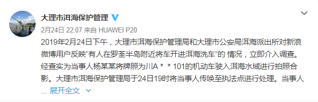 大理市洱海保护管理局官方微博称,2019年2月24日下午,大理市洱海保护管理局和大理市公安局洱海派出所对新浪微博用户反映“有人在罗荃半岛附近将车开进洱海洗车”的情况,立即介入调查。经查实为当事人杨某某将牌照为川A**101的机动车驶入洱海水域进行拍照合影。大理市洱海保护管理局于24日19时将当事人传唤至执法点进行处理。当事人对驾驶车辆进入洱海水域拍照的事实供认不讳。大理市洱海保护管理局依据《云南省大理白族自治州洱海保护管理条例》的规定,对当事人杨某某处以2000元的罚款。在此,呼吁广大群众,增强洱海保护意识,发现此类行为及时制止。