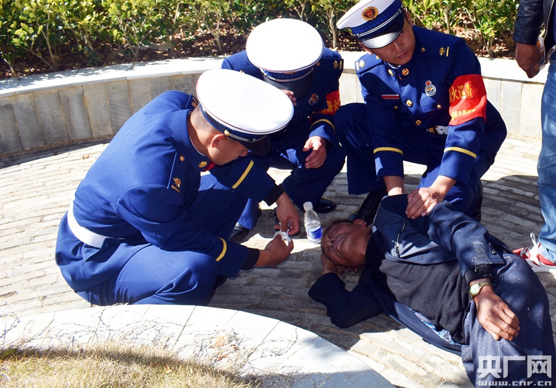 “同志!同志!前面有一位老人晕倒了,你们快去看看。”保山市龙陵县松山抗战纪念遗址执勤队员李沂洲接到一名群众的求助,他立即和随行的李正彪第一时间赶往事发地域。在确认环境安全的前提下,李沂洲一边叫队友帮忙疏散附近围观群众,一边通过拍肩呼喊、检查呼吸道有无异物等急救手段开展应急救护,患病老人在急救中恢复意识,在其家人的陪护下前往医院进行后续治疗。“当时我就在附近,老年人突然晕倒,特别吓人,辛亏消防队员及时赶到,不然指不定发生什么事呢。”求助群众激动地说,好在老人已经苏醒过来,有惊无险。