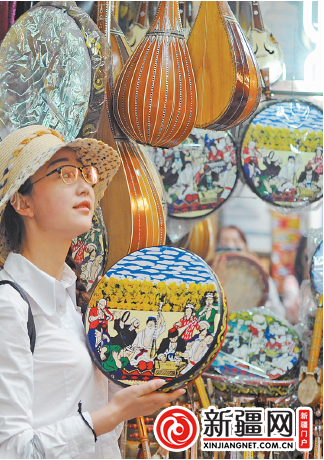 五一假期,新疆国际大巴扎迎来旅游高峰。不少来自国内外的游客在这里游览、购物。昨日,在新疆国际大巴扎,一名来自内地的游客正在挑选手鼓。