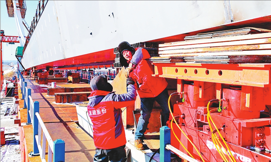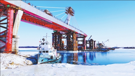 春节期间,正是黑河中俄黑龙江大桥建设进入关键阶段时刻,黑龙江龙建路桥股份有限公司上百名建设者放弃过年与家人团聚,冒着零下30多摄氏度的严寒,顶着江面刺骨的寒风,日夜奋战在大桥工地,在施工现场度过一个忙碌的春节。据介绍,目前黑龙江大桥施工正在进行钢梁拼装工作,每天以12米到15米的进度稳步推进,预计将在3月底前胜利完成中俄对接合龙。 郭旭东记者邵国良摄