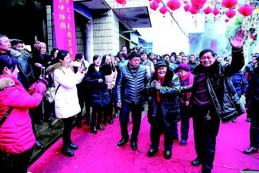 2月8日,大年初四,大冶市还地桥镇下堰村肖家堰湾一片喜庆,400多名亲友聚集在一起,为肖绪祥和黄翠兰夫妻俩庆祝百岁生日。