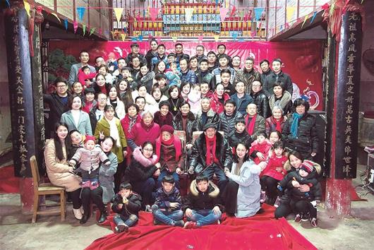图为2月8日,大年初四,大冶市还地桥镇下堰村肖家堰湾一片喜庆,400多名亲友聚集在一起,为肖绪祥和黄翠兰夫妻俩庆祝百岁生日。图为老人一家五世同堂一起拍全家福 通讯员汪泽栋摄