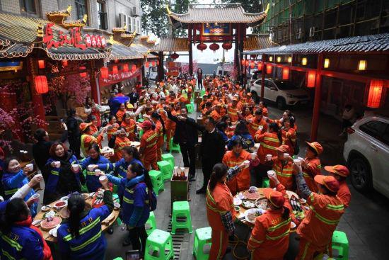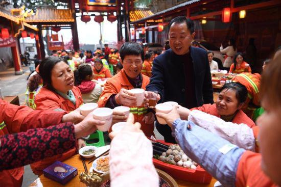 中新网重庆新闻3月9日电(记者 陈超)重庆长江汇码头火锅店的老板邀请了渝中区150余位环卫女工免费吃火锅坝坝宴,庆祝国际劳动妇女节的来临。火锅店里还悬挂起写有“环卫女工你们是最美女神”的横幅,为她们营造出浓厚的节日氛围。