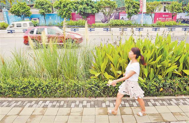 两江新区学堂路,行人从齐人高的植物旁走过。记者 张锦辉 摄