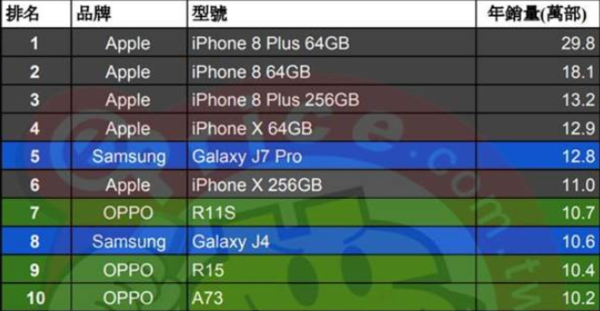从榜单来看,最受欢迎的机型是iPhone 8 Plus(64GB),销量达到29.8万部,其次是iPhone 8(64GB)、iPhone 8 Plus(256GB)、iPhone X(64GB),第五名为三星Galaxy J7 Pro,第六名仍旧是iPhone X,苹果可谓是在台湾风生水起。