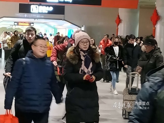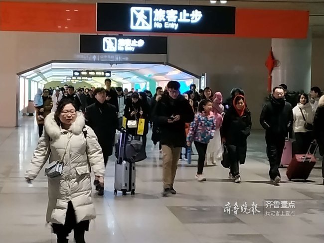2月9日晚6点左右,记者在济南火车站出站口看到,随着一趟趟列车的到达,出站口返城旅客一拨接着一拨,大多数返城旅客都是大包小提溜的,不少是从老家带回的土特产。出站口处四部自动扶梯也开足了马力运送到站的旅客。