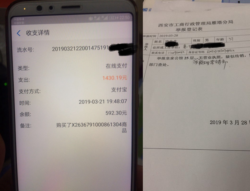 日前陆先生曾到派出所报警,但警方称此事系工商管辖范围。28日上午,陆先生去往小寨工商所举报了此事,工商所工作人员表示暂不能定性,将立刻汇报进一步调查处理此事。