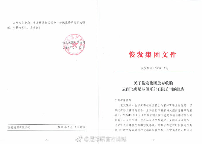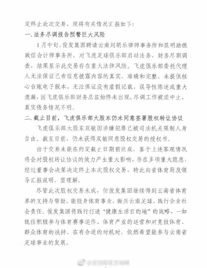 云南飞虎球员讨薪一事有了新的情况。本报最新了解到,意向投资方俊发集团所承诺的“按时发放工资”,其前提是完成股权收购,而目前的现实情况是,在约定交易截止日之前,俊发集团仍未获得飞虎俱乐部大股东同意股权交易的授权书。鉴于此客观情况,俊发集团董事会决策决定,终止本次股权交易,并且已向云南省体育局汇报情况,递交了放弃收购报告。