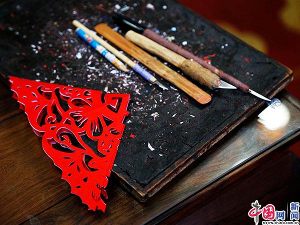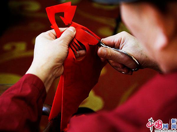 刚刚画好图样的红纸,在姚雨林的手中即将成为一幅窗花作品。中国网实习记者 张钰 摄【点击观看组图】