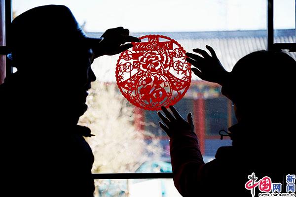 姚雨林和他的学生一起将剪好的窗花贴在窗户上。中国网实习记者 张钰 摄