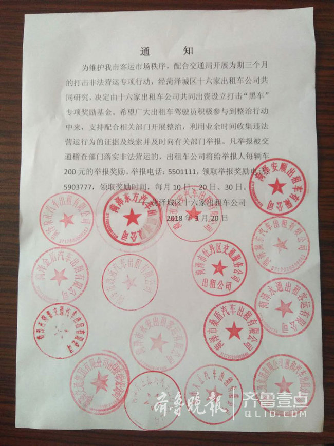 这则通知是一张翻拍的照片,通知显示“为维护我市客运市场秩序,配合交通局开展为期三个月的打击非法营运专项行动,经菏泽城区十六家出租车公司共同研究,决定由十六家出租车公司共同出资设立打击‘黑车’专项奖励基金……凡举报被交通稽查部门落实非法营运的,出租车公司将给举报人每辆车200元的举报奖励”。