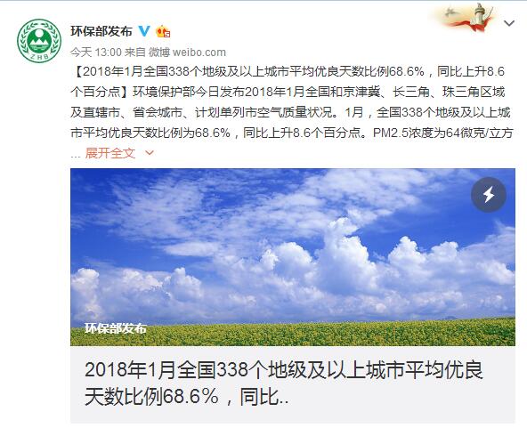 环境保护部有关负责人介绍,1月,全国338个地级及以上城市平均优良天数比例为68.6%,同比上升8.6个百分点。PM2.5浓度为64微克/立方米,同比下降17.9%;PM10浓度为98微克/立方米,同比下降16.2%。