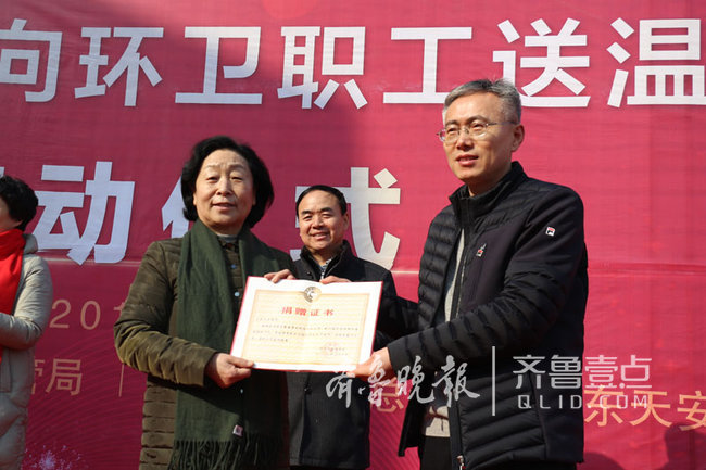 活动现场,天安集团捐赠30万元为牡丹区、开发区、高新区共2600多名环卫职工发放生活用品,并为200多名家庭困难的环卫职工发放慰问金,菏泽市慈善总会会长童彩云向山东天安集团颁发捐赠证书。