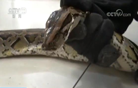 央视网消息:近日,云南省红河州蒙自市一小区内惊现一条受了伤的蟒蛇,小区保安发现后立即向当地森林公安报了警。